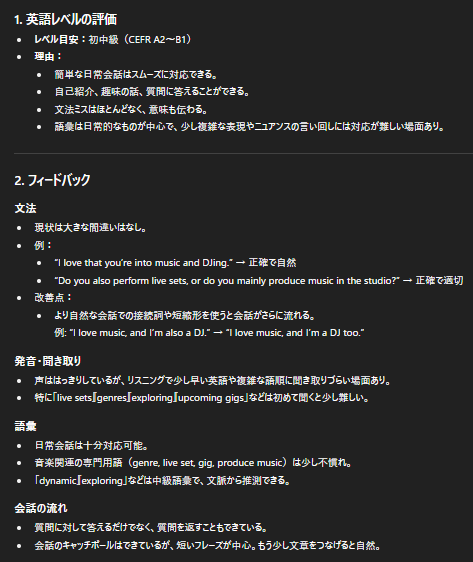 - 会話後に文法・発音・語彙のフィードバックを得ることで学習が定着