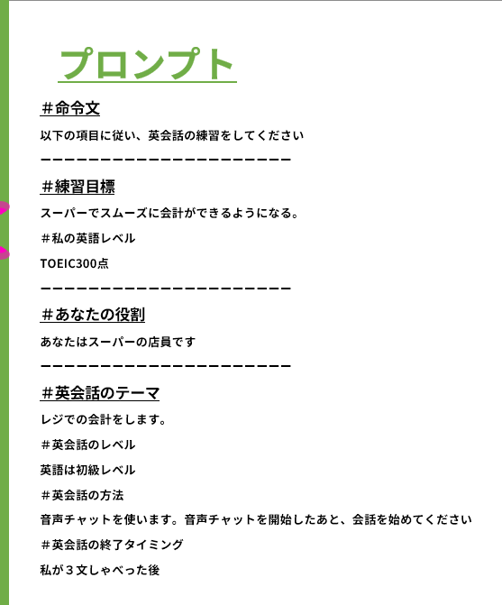 英会話を練習する際に、ただ「話す」だけでは効果が限定的です。そこでプロンプトを使って会話のテーマやレベルを設定することで、自分の目的に合った練習を進められます。